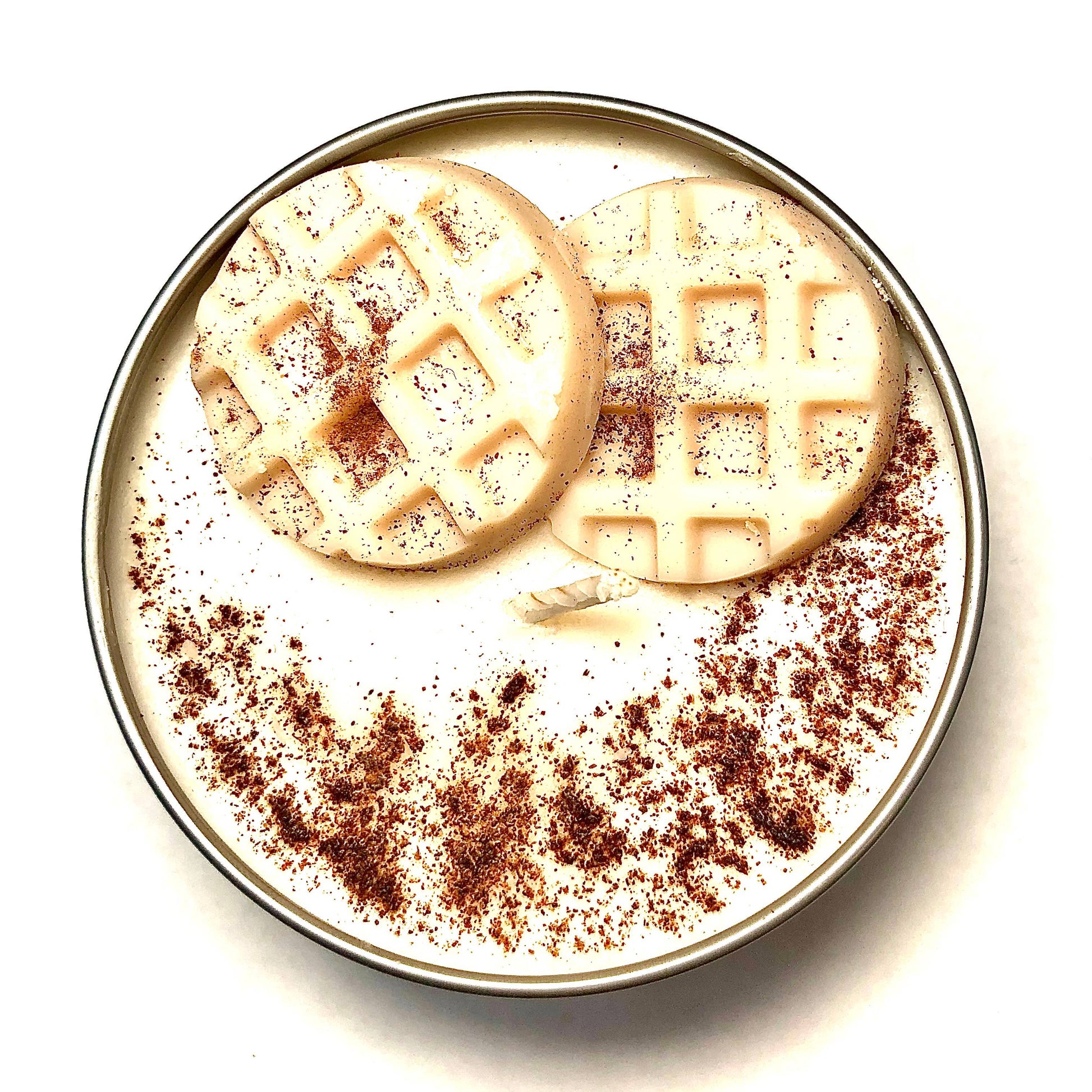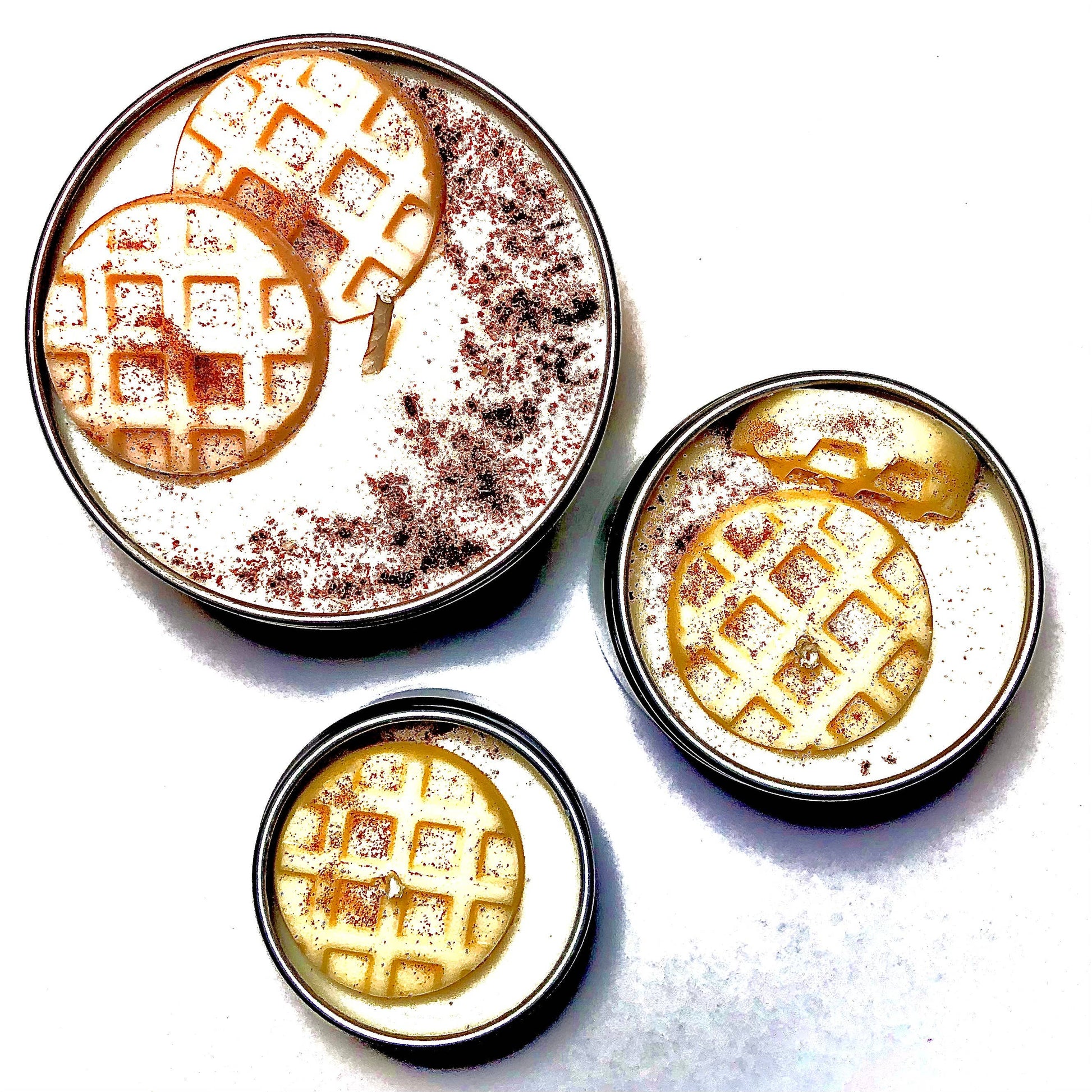 Attributes & occasions: food, sweets, breakfast, waffles, cinnamon, maple, comfort, whimsical, unique, thank you, birthday, favor, confection, bakery.2 oz tins measure 2.05 inches wide, 1.38 inches tall. 4 oz. tins measure 2.4 inches wide and 1.8 inches tall. 8 oz. tins measure 3.2 inches wide and 2 inches tall. Keep candle free of debris and wick trimmings. Trim wick to 1/8-1/4 inch before each use. Never leave burning unattended or within reach of children or pets.