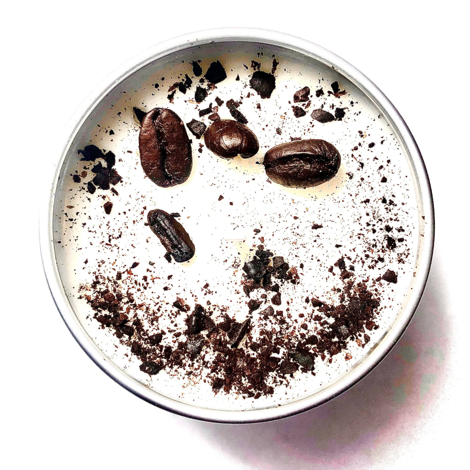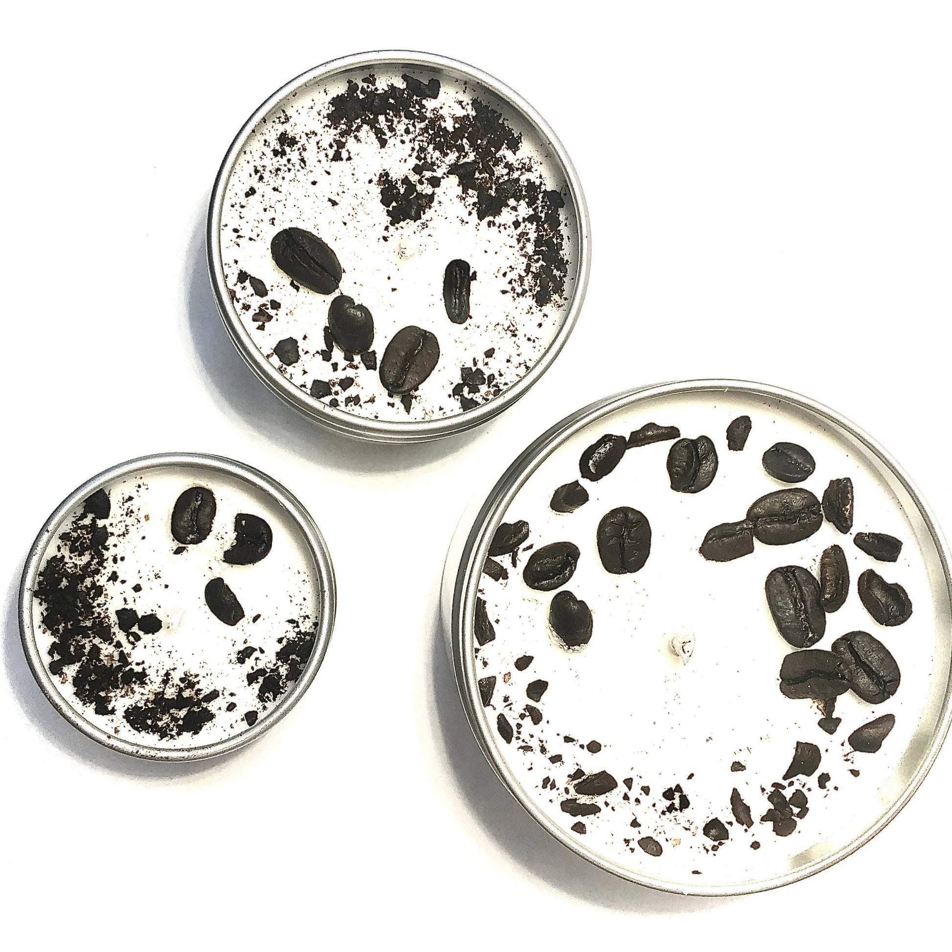 Hand-poured soy candle: with scents reminiscent of your favorite coffee shop: with coffee, cinnamon, nutmeg, vanilla, and notes of honey, dressed with whole and ground coffee beans. Three tin sizes available with round brand label. Made with soy wax, cotton wick and phthalate free fragrance.